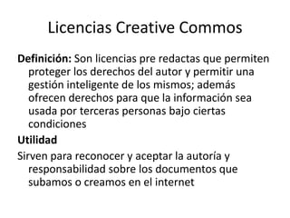 Las licencias Creative Commons son licencias pre redactadas que permiten proteger los derechos de autor y compartir contenido bajo ciertas condiciones. Existen cuatro tipos principales de licencias Creative Commons: Reconocimiento, que requiere reconocer la autoría; Reconocimiento Sin Derivar, que no permite manipular el contenido; Reconocimiento No Comercial, que permite usar el contenido sin fines de lucro; y algunas que combinan estas restricciones.