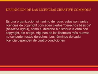 La licencia Creative Commons permite a los autores compartir sus obras con ciertas condiciones predefinidas como el reconocimiento de la autoría, uso no comercial, prohibición de obras derivadas o el requisito de compartir las obras derivadas bajo la misma licencia. La licencia Creative Commons es una organización sin fines de lucro que ofrece diferentes opciones de licencias de derechos de autor para promover la creatividad compartida.
