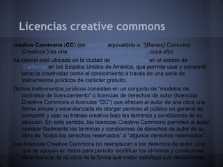 Creative Commons es una organización sin fines de lucro que permite compartir y usar la creatividad y el conocimiento a través de licencias gratuitas. Estas licencias Creative Commons son contratos de licenciamiento de derechos de autor que ofrecen a los autores una forma sencilla de dar permiso al público para compartir y usar su trabajo bajo los términos que elijan, cambiando los derechos de "todo reservado" a "algunos reservados". Las licencias no reemplazan los derechos de autor sino que se basan en ellos para modificar los tér