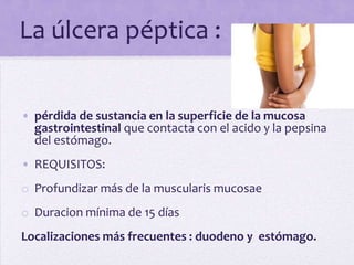 La úlcera péptica se produce por la pérdida de sustancia en la mucosa gastrointestinal debido al contacto con el ácido y la pepsina estomacal. Las causas más comunes son la infección por Helicobacter pylori y el uso de antiinflamatorios no esteroideos. El diagnóstico se realiza mediante endoscopia y pruebas para detectar H. pylori. El tratamiento incluye medidas dietéticas, antibióticos para erradicar H. pylori, e inhibidores de la bomba de protones para reducir la secreción á