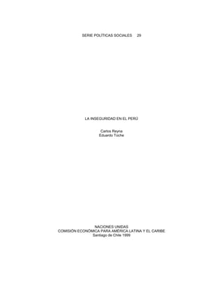 Este documento analiza los niveles de inseguridad en Perú entre 1990 y 1996. Reunió datos oficiales sobre delitos contra la vida, el patrimonio, violaciones de derechos humanos, narcotráfico, terrorismo, consumo de drogas y accidentes de tránsito para crear índices de inseguridad por departamento. Estos índices muestran las tendencias de violencia e identifican los departamentos más afectados, ayudando a comprender mejor el problema de la inseguridad en el país. Sin embargo, los autores reconocen que los
