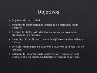Este documento presenta información sobre lesiones no cariosas del cuello dental.