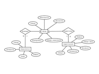 El documento describe la información de varios empleados de un despacho de arquitectura, incluyendo su código, nombre, cargo y categoría. También detalla los datos de varias obras a cargo de los arquitectos como su código, descripción, ubicación, presupuesto y el código del arquitecto encargado. Además, indica los datos de los supervisores de cada obra como su código, nombre, categoría y el código de la obra que supervisan.