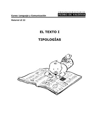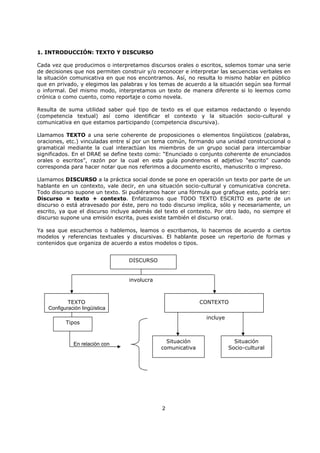 Este documento introduce los conceptos de texto y discurso, señalando que un discurso involucra un texto en un contexto específico. Luego explica cuatro criterios para clasificar tipos de discursos: socio-cultural, situacional, funcional y estructural. Finalmente, describe los planos de organización textual y las secuencias textuales que componen un texto.