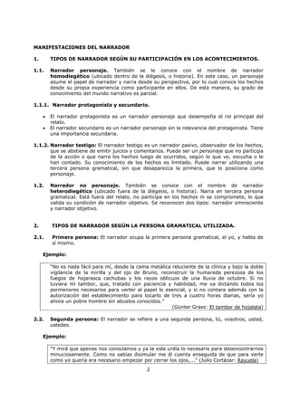 Este documento describe los diferentes tipos de narrador según su participación en los hechos narrados, la persona gramatical utilizada, su focalización o perspectiva, su grado de conocimiento del mundo representado y los modos o estilos narrativos. Explica que un narrador puede ser personaje o no personaje, omnisciente u objetivo, y que la narración puede seguir un orden cronológico o no lineal.