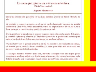 El documento presenta información sobre el escritor guatemalteco Augusto Monterroso, conocido por haber creado el género literario del microrrelato. Incluye un breve microrrelato de Monterroso y luego proporciona ejemplos comunes de saludos y presentaciones informales y formales en español, así como algunos falsos amigos entre español e inglés.