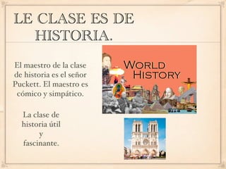 La clase de español es enseñada por la Señora Perez, una maestra excelente y buena. La clase de historia es enseñada por el Señor Puckett, un maestro cómico y simpático. La clase de biología es enseñada por la Señora Winters, una maestra cómica y honesta.