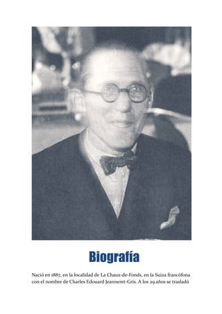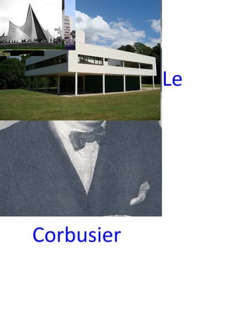 Le Corbusier fue un arquitecto suizo-francés nacido en 1887 que adoptó el pseudónimo "Le Corbusier" y se trasladó a París en sus veintes. Desarrolló un estilo arquitectónico moderno caracterizado por plantas libres, fachadas libres, ventanas alargadas y terrazas-jardines. Una de sus obras más importantes fue la Villa Savoye de 1929, considerada un paradigma de la Arquitectura Internacional del siglo XX. Trabajó incansablemente para difundir sus ideas urbanas