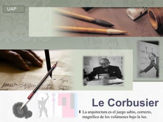 Este documento resume las principales ideas y propuestas arquitectónicas de Le Corbusier. En particular, destaca cinco principios de diseño como los pilotis, la planta libre, la fachada libre, las ventanas horizontales y las terrazas ajardinadas. También analiza obras clave como la Casa Citrohan y la Villa Savoye, resaltando su enfoque funcional, formal y espacial. Finalmente, describe las diferentes fases evolutivas en el pensamiento de Le Corbusier, incluyendo su visión de la casa como una "máquina