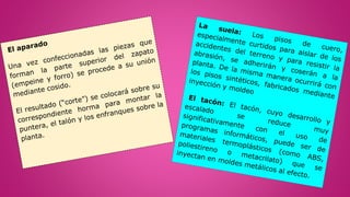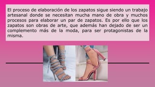 El documento describe el proceso de elaboración de zapatos, el cual sigue siendo artesanal y requiere de muchos pasos y mano de obra. La horma, el diseño y el escalado son pasos iniciales clave. Luego, la piel es cortada manualmente o con maquinaria y se le da forma al zapato. Tras limpiarlo y embalarlo, el zapato terminado es el resultado de un complejo proceso artesanal y se ha convertido en una pieza indispensable de moda.