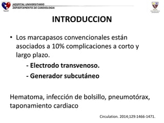 Este documento describe un estudio clínico de un marcapasos sin electrodos completamente implantable. El estudio encontró que la implantación del dispositivo fue exitosa en el 97% de los pacientes y se completó en 28 minutos en promedio. A los 3 meses de seguimiento, las mediciones del rendimiento del dispositivo se mantuvieron estables. Sin embargo, un paciente desarrolló una perforación ventricular durante el procedimiento y falleció posteriormente. El estudio concluye que este marcapasos sin electrodos podría representar un cambio de paradigma en la estimulación card