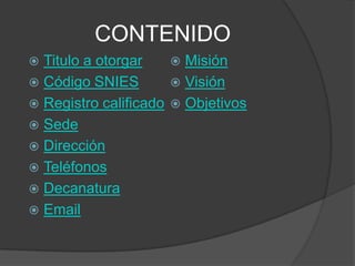 Este documento presenta la información básica sobre el programa de Ciencias del Deporte de la Universidad de Ciencias Aplicadas y Ambientales (U.D.C.A.), incluyendo el título otorgado (Profesional en Ciencias del Deporte), la duración de 10 semestres, el código del Sistema Nacional de Información de la Educación Superior, el registro calificado, la sede y sus instalaciones, la dirección, contactos, decanatura, misión, visión y objetivos del programa.