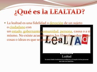 La lealtad se refiere a la fidelidad o devoción hacia un estado, gobernante, comunidad, persona u otra causa. Existen diferentes perspectivas sobre qué o quién merece lealtad. La lealtad ha sido estudiada por filósofos, psicólogos, sociólogos y teóricos políticos. Desde una perspectiva cristiana, la lealtad hacia Dios tiene prioridad sobre la lealtad hacia otros. Josiah Royce definió la lealtad como una virtud central que implica la devoción hacia una causa externa a