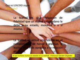 Este documento describe diferentes tipos de lealtad, incluyendo la lealtad a los padres, hermanos, vida, amigos, pareja, trabajo, animales y Dios. Explica que la lealtad implica fidelidad y gratitud hacia estas personas y cosas importantes. También incluye varias citas que enfatizan la importancia de practicar la virtud de la lealtad en las relaciones.