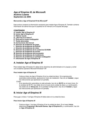 Este documento proporciona información sobre la instalación, inicio y modo multijugador de Age of Empires III. Incluye instrucciones para instalar el juego, iniciar una partida individual o multijugador local o en línea, y obtener ayuda sobre el juego. También contiene soluciones a problemas comunes y detalles sobre las funciones del modo multijugador en línea a través de Ensemble Studios Online.