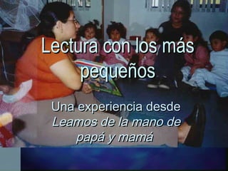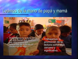 Este documento describe un proyecto de promoción de la lectura llamado "Leamos de la mano de papá y mamá". El proyecto busca fomentar la lectura compartida entre padres e hijos a través de la selección de textos de calidad, oportunidades frecuentes de lectura y una mediación adecuada. Se enfatiza la importancia de la observación y el registro de las sesiones de lectura para mejorar continuamente el proyecto.