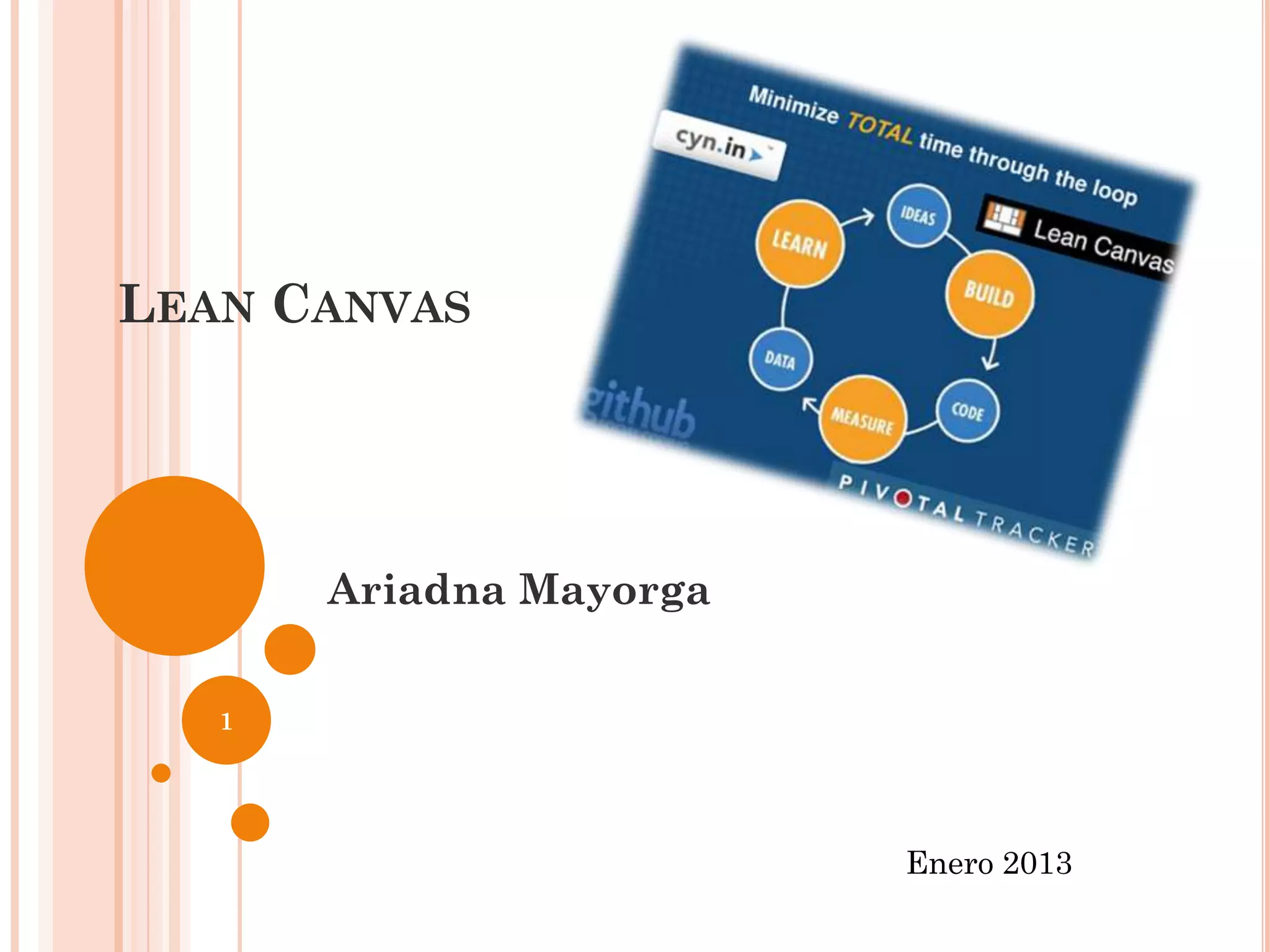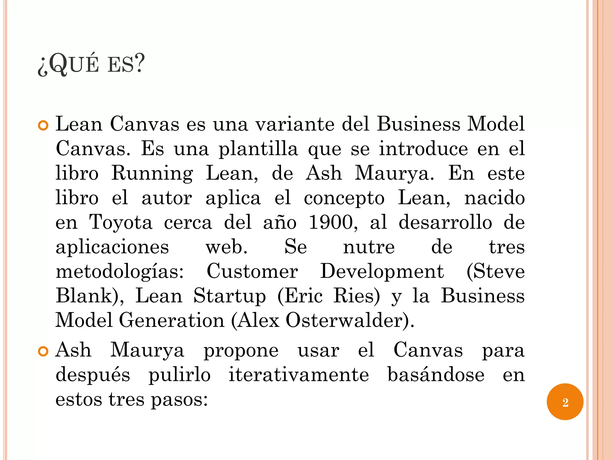El Lean Canvas es una herramienta para diseñar modelos de negocio que se enfoca en startups y empresas en fases tempranas. Consiste en una plantilla con bloques como problema, solución, métricas clave y ventaja competitiva. El Lean Canvas se usa de forma iterativa basada en feedback de clientes para refinar el producto, y complementa herramientas como el Business Model Canvas al enfocarse más en la ejecución que en el análisis integral del modelo.