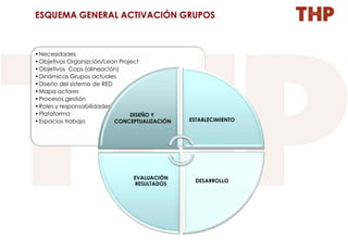 Este documento describe un esquema general para activar grupos de comunidades de práctica para apoyar la implantación de Lean. El esquema incluye las fases de diseño y conceptualización, establecimiento, desarrollo y evaluación. También describe cómo las comunidades de práctica pueden apoyar la implantación de Lean en las etapas de conocimiento, gestión y transformación.