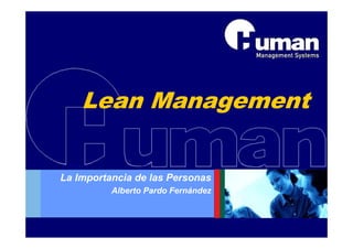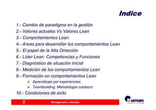 Este documento describe los principios del Lean Management y la importancia de las personas en este enfoque. Explica que el Lean Management requiere una transición hacia valores como la responsabilidad, la transparencia y la mejora continua. También describe ocho comportamientos clave para el Lean y áreas para desarrollar estos comportamientos, como aprender de la experiencia y trabajar en equipo. Finalmente, discute el papel fundamental que juega la alta dirección en impulsar esta transición cultural hacia una organización Lean.