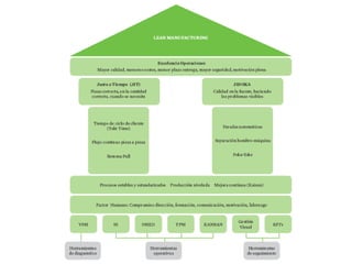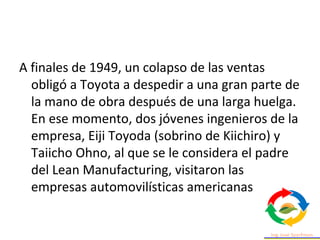 1) El documento describe el origen y desarrollo del sistema Lean Manufacturing o Just in Time (JIT) en Toyota a finales de los años 1940. 2) El sistema JIT se basa en la producción de solo lo que se necesita, cuando se necesita, en las cantidades necesarias para eliminar el desperdicio. 3) El sistema se ha extendido a otras empresas japonesas y ha contribuido a mejorar su ventaja competitiva frente a Occidente.