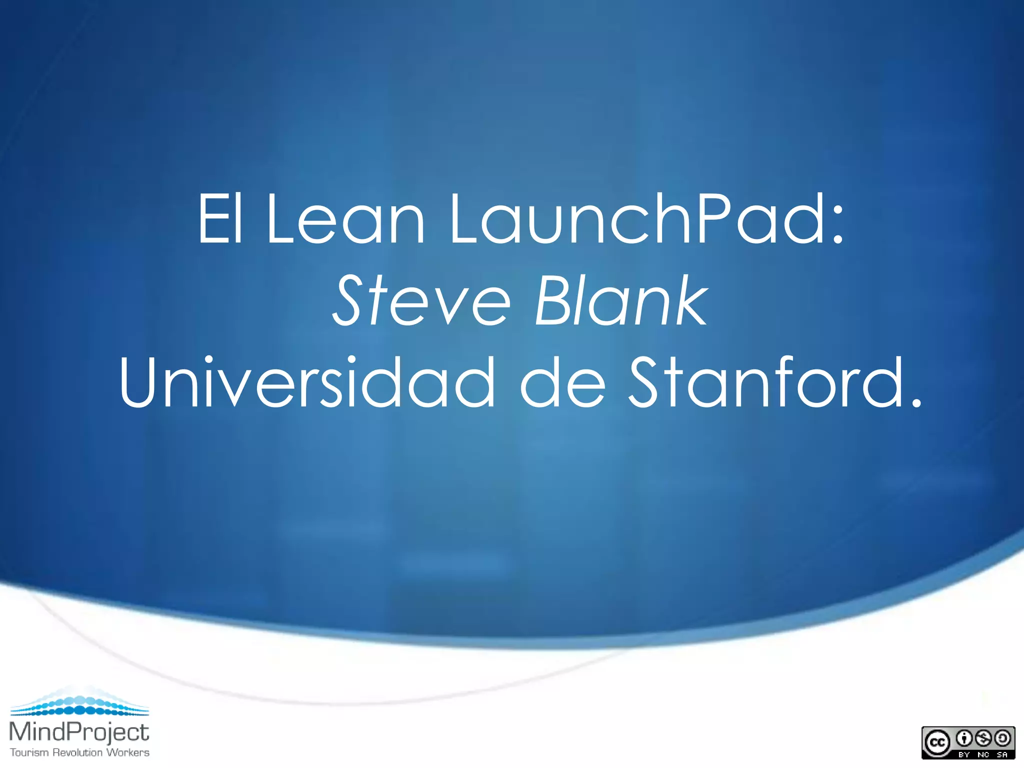 Este documento resume un curso sobre el Lean LaunchPad desarrollado por Steve Blank en la Universidad de Stanford. El curso enseña a los estudiantes a pensar en todas las partes de la construcción de un negocio, no sólo en el producto, mediante el uso de herramientas de gestión para emprendedores basadas en el modelo de negocio, el desarrollo del cliente y el desarrollo ágil. Los estudiantes ponen a prueba sus suposiciones sobre su modelo de negocio saliendo del aula para interactuar con clientes y socios, e