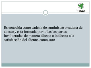 La cadena de suministro incluye a todos los involucrados en satisfacer al cliente, como fabricantes, proveedores, transportistas, clientes y almacenistas. Se diseña para mejorar continuamente las cadenas de suministro de las empresas manufactureras debido a que mantiene la producción al facilitar el flujo de materiales y productos terminados. Una adecuada gestión requiere revisar que los departamentos de compras, fabricación, almacén y envíos cumplan sus funciones para garantizar el flujo correcto de materiales, lo cual es vital para satisfacer