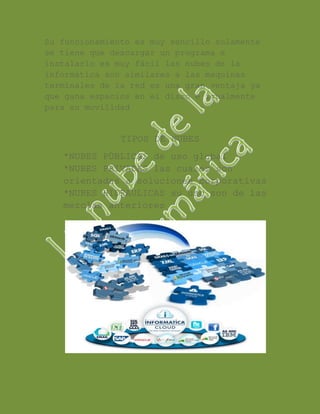 La computación en la nube permite a los usuarios almacenar información en servidores de internet, funcionando de manera sencilla mediante la descarga e instalación de programas. Existen diferentes tipos de nubes, incluyendo nubes públicas, privadas y hidráulicas, cada una con sus propósitos específicos. Esta tecnología optimiza el espacio en disco y mejora la movilidad de los datos.