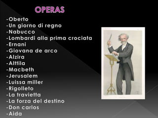 El documento habla sobre la obra Nabucco de Giuseppe Verdi, una tragedia lírica en 4 partes basada en el Antiguo Testamento. Fue estrenada en 1842 en La Scala de Milán y cuenta la historia de Nabucodonosor. También menciona que Verdi escribió muchas obras para orquestas aficionadas que luego destruyó, y que en 1982 fue descubierto un asteroide llamado (3975) Verdi en su honor.