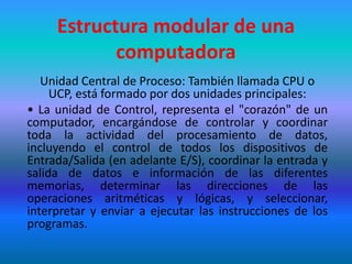 El documento describe los principales componentes de una computadora, incluyendo la unidad central de procesamiento (CPU), la memoria principal (RAM y ROM), la memoria auxiliar, y los dispositivos de entrada y salida. La CPU está compuesta por la unidad de control y la unidad aritmética y lógica. La memoria principal almacena temporalmente datos e instrucciones, mientras que la memoria auxiliar ofrece almacenamiento a largo plazo. Los dispositivos de entrada permiten que los usuarios introduzcan datos a la computadora, y los dispositivos de sal