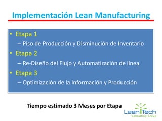 El documento detalla un plan de implementación de Lean Manufacturing en tres etapas, comenzando con la optimización del piso de producción y la reducción de inventarios, seguido por el rediseño del flujo de trabajo y la automatización, y finalizando con la optimización de la información y la producción. Cada etapa incluye una serie de herramientas y beneficios, como la aplicación de 5S, Kanban y SMED, que aumentan la productividad y reducen costos y tiempos de entrega. Se mencionan indicadores que muestran mejoras significativas en la exactitud del inventario y la eficiencia operativa tras la implementación.