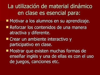 El documento propone varias estrategias para motivar a los alumnos en el aprendizaje del inglés de manera dinámica e interactiva, incluyendo el uso de juegos, canciones, decoración visual y actividades creativas en clase, así como nombrar "ayudantes" entre los estudiantes.