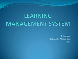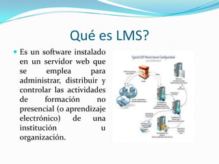 Este documento describe los sistemas de gestión del aprendizaje (LMS). Un LMS es un software que se usa para administrar, distribuir y controlar la formación no presencial mediante Internet. Un LMS almacena contenidos educativos y herramientas de comunicación como correo electrónico y foros. Ofrece ventajas como soportar grandes cantidades de usuarios y cursos, pero también tiene desventajas como falta de personalización o documentación.