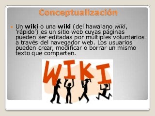 Un wiki es un sitio web cuyas páginas pueden ser editadas por múltiples usuarios a través de un navegador web. Los wikis permiten que los usuarios creen, modifiquen o eliminen texto de manera colaborativa. Algunas características clave de los wikis incluyen que conservan un historial de cambios, usan un sistema de marcas hipertextuales simplificado, y tienen una estructura flexible sin una forma predefinida. El "espíritu wiki" promueve compartir conocimiento de manera abierta y col