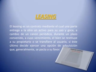El leasing es un contrato mediante el cual una parte entrega a la otra un activo para su uso y goce a cambio de un canon periódico durante un plazo convenido, tras el cual el bien se devuelve a su propietario o se transfiere al usuario si este ejerce la opción de compra. Existen dos tipos principales de leasing: el leasing financiero, donde el usuario adquiere el bien al final del contrato, y el leasing operativo, donde el bien se devuelve al propietario. El leasing implica la intervención de una compañía de financiam
