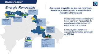 El documento resume 7 proyectos de energía renovable en República Dominicana en los que participa el Banco Popular como financiador o banco agente, incluyendo plantas solares, eólicas y de biomasa con una capacidad total de generación de 378 MW. Además, a través de su producto de Leasing Verde, el banco ha financiado más de RD$350 millones en paneles solares para hogares y empresas.