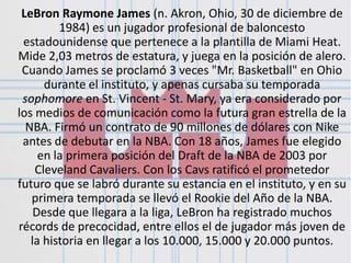 LeBron James es una estrella de la NBA que juega para los Miami Heat. Mide 2.03 metros y juega como alero. Firmó un contrato de 90 millones de dólares con Nike antes de ser elegido número uno en el draft de 2003 por los Cleveland Cavaliers. Con los Cavaliers y Heat ha ganado varios premios individuales como el MVP y ha liderado a su equipo a las Finales de la NBA en múltiples ocasiones.