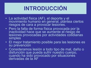 El documento describe diferentes tipos de lesiones deportivas, incluyendo sus definiciones, síntomas, diagnósticos y tratamientos. Explica lesiones causadas por traumatismos como fracturas, luxaciones, desgarros de ligamentos, distensiones musculares y lesiones de tendones. También cubre síndromes por abuso, inflamaciones, dolores y otras lesiones comunes en la piel y músculos. El mejor tratamiento para prevenir lesiones es la progresión adecuada en el entrenamiento, calentamiento, uso de equipamiento correcto y seguir