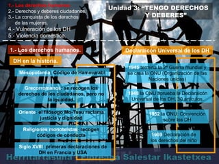 El documento trata sobre los derechos y deberes humanos. Explica la historia de los derechos humanos desde la antigüedad hasta la actualidad, incluyendo la Declaración Universal de los Derechos Humanos de 1948. También habla sobre los derechos y deberes de los ciudadanos, la conquista de los derechos de las mujeres a lo largo de los siglos, la vulneración de los derechos humanos y la violencia doméstica.