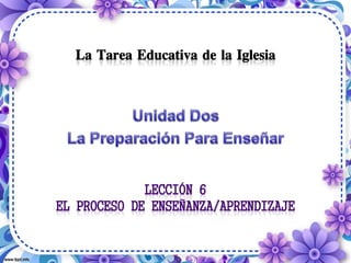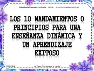 El documento describe los principios clave de la enseñanza y el aprendizaje efectivos. Explica que la enseñanza es un proceso que debe producir cambios deseables en los estudiantes a través del aprendizaje. Señala diez factores importantes para el aprendizaje como el poder del Espíritu, el modelado, la motivación, la participación de los estudiantes, y la creación de condiciones agradables. El objetivo final es que los estudiantes se conviertan en nuevas criaturas en Cristo a través de una enseñanza