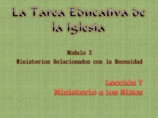 El documento discute la importancia de la educación de los niños en la iglesia. Señala que los niños necesitan guía espiritual de la iglesia y la iglesia necesita a los niños para cumplir su misión. También cubre consideraciones de desarrollo apropiadas para diferentes edades de niños, la importancia de evangelizar a los niños y diferentes formas de ministerio.