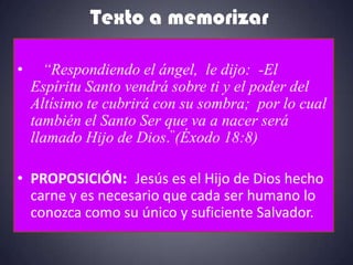 Este documento resume el primer capítulo del Evangelio de Lucas. Describe el anuncio del nacimiento de Juan el Bautista y Jesús, sus respectivas concepciones, y los eventos que rodearon sus nacimientos. También presenta a Jesús como el Hijo de Dios hecho carne y la necesidad de recibirlo como único Salvador.