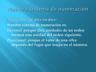Este documento describe diferentes sistemas de numeración como el sistema de numeración egipcio, los números romanos y el sistema de numeración actual. Explica cómo se representan los números grandes en nuestro sistema de numeración posicional y cómo se dividen en millones, millares y unidades.