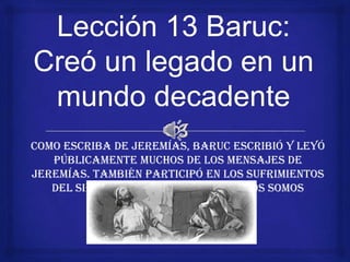 Lección 13 Baruc:Creó un legado en un mundo decadenteComo escriba de Jeremías, Baruc escribió y leyó públicamente muchos de los mensajes de Jeremías. También participó en los sufrimientos del siervo de Dios, en los que todos somos llamados a participar.