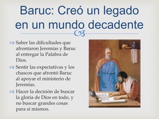 El documento habla sobre Baruc, el escriba de Jeremías. Baruc escribió y leyó públicamente los mensajes de Jeremías aunque enfrentaron muchas dificultades. A pesar del mundo decadente en que vivían, Baruc ayudó a preservar la Palabra de Dios.