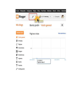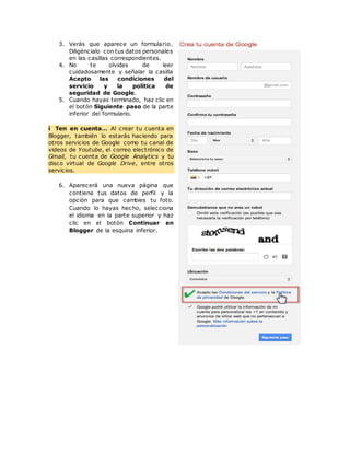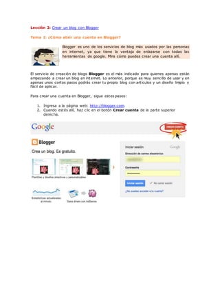 Este documento proporciona instrucciones sobre cómo crear una cuenta en Blogger, crear un blog nuevo y publicar el primer artículo. Explica que Blogger es un servicio de blogs fácil de usar que permite crear una cuenta vinculada a servicios de Google como Gmail. Detalla los pasos para completar un formulario de registro, seleccionar un diseño de plantilla y hacer clic en "Crear blog" para lanzar un nuevo sitio. Luego guía al usuario a través de los pasos para publicar su primer artículo haciendo clic en un icono