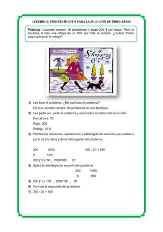 Lourdes compró 10 pantalones por $200. La tienda le dio un 10% de descuento en la compra total. Para calcular cuánto pagó Lourdes con el descuento, se debe: 1) leer el problema para entender los detalles, 2) identificar los datos (10 pantalones, $200 pagados originalmente, 10% de descuento), y 3) aplicar la fórmula para calcular el 10% de $200 y restar ese monto del total original para encontrar el monto final pagado.
