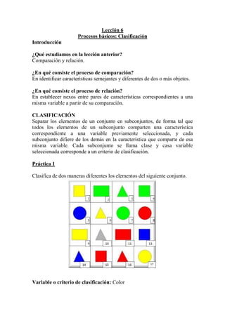 Este documento explica el proceso de clasificación, el cual consiste en separar los elementos de un conjunto en subconjuntos de acuerdo a una variable o criterio de clasificación seleccionado. Se presentan varios ejemplos de clasificación de diferentes conjuntos de elementos utilizando criterios como el color, la forma, la presencia de letras y la presencia de alcohol. El documento concluye definiendo conceptos clave como clase, criterio de clasificación y las características que diferencian una clase de otra.