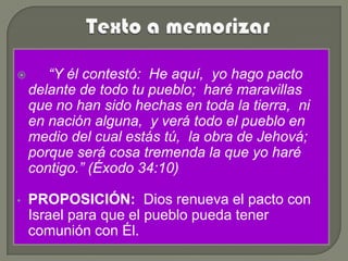 El documento resume el libro de Éxodo desde el capítulo 31 al 35. Se describe cómo Dios llamó a artesanos para construir el tabernáculo, cómo el pueblo construyó un becerro de oro mientras Moisés estaba en el monte, y cómo Dios renovó su pacto con Israel estableciendo nuevas leyes. Los objetivos son comprender los pasos que llevaron a la renovación del pacto y ser conscientes de la necesidad de renovar el compromiso con Dios continuamente.