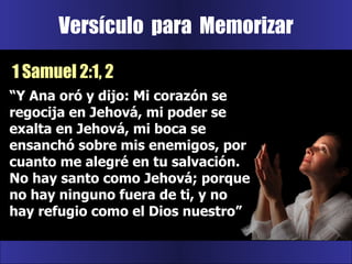 Este documento presenta una lección bíblica sobre la confianza en Dios a través de la historia de Ana en el Antiguo Testamento. Explica que Ana oraba honestamente a Dios sobre su dolor de no poder tener hijos y agradeció a Dios después de que le concedió un hijo. La lección enseña que al aceptar que somos hijos de Dios y orar y agradecerle a Dios por todo, podemos experimentar la confianza en Él.