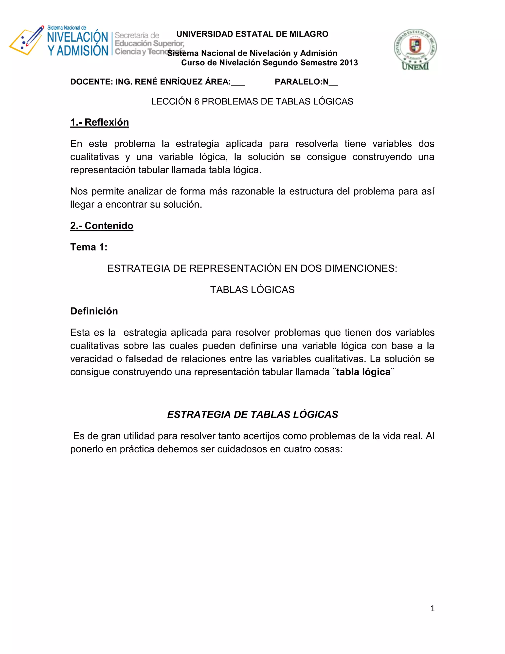 UNIVERSIDAD ESTATAL DEMILAGRO Sistema Nacional de Nivelación y Admisión Curso de Nivelación Segundo Semestre 2013 DOCENTE: ING. RENÉ ENRÍQUEZ ÁREA:___ PARALELO:N__ LECCIÓN 6 PROBLEMAS DE TABLAS LÓGICAS 1.- Reflexión En este problema la estrategia aplicada para resolverla tiene variables dos cualitativas y una variable lógica, la solución se consigue construyendo una representación tabular llamada tabla lógica. Nos permite analizar de forma más razonable la estructura del problema para así llegar a encontrar su solución. 2.- Contenido Tema 1: ESTRATEGIA DE REPRESENTACIÓN EN DOS DIMENCIONES: TABLAS LÓGICAS Definición Esta es la estrategia aplicada para resolver problemas que tienen dos variables cualitativas sobre las cuales pueden definirse una variable lógica con base a la veracidad o falsedad de relaciones entre las variables cualitativas. La solución se consigue construyendo una representación tabular llamada ¨tabla lógica¨ ESTRATEGIA DE TABLAS LÓGICAS Es de gran utilidad para resolver tanto acertijos como problemas de la vida real. Al ponerlo en práctica debemos ser cuidadosos en cuatro cosas: 1